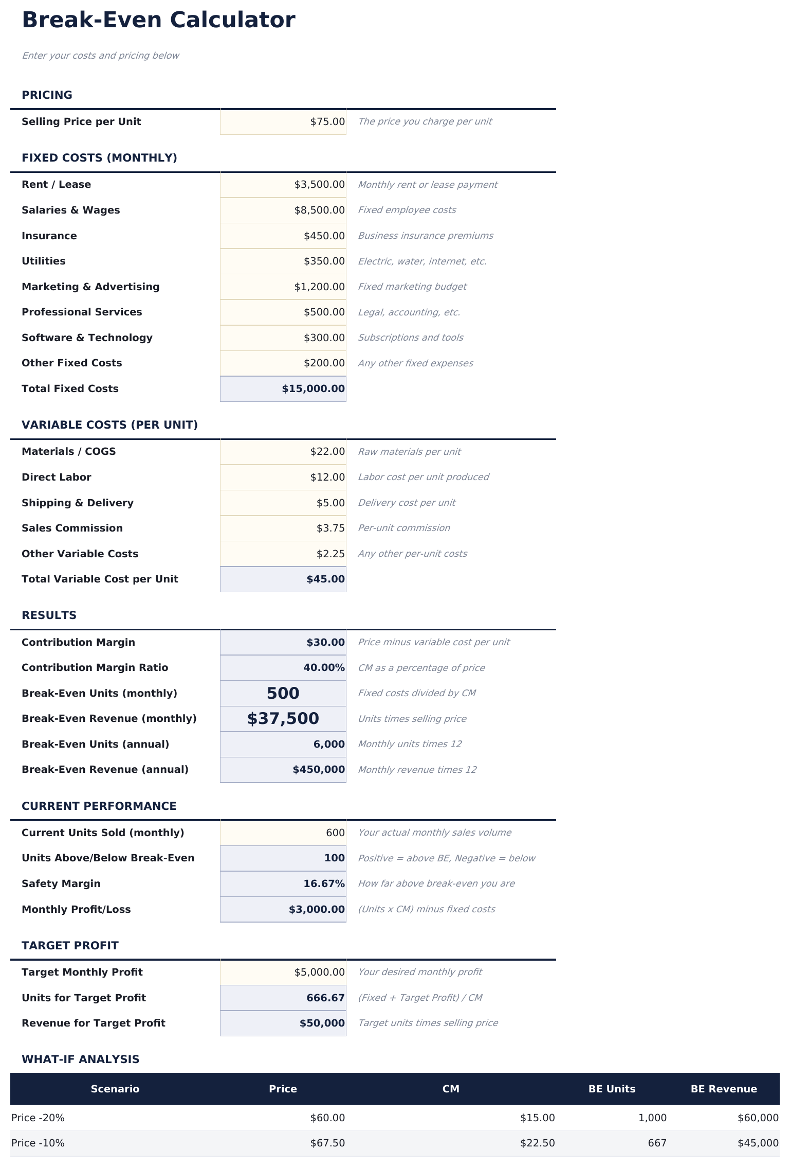 - Break-even unit and revenue calculations that update automatically whenever you adjust cost or pricing inputs